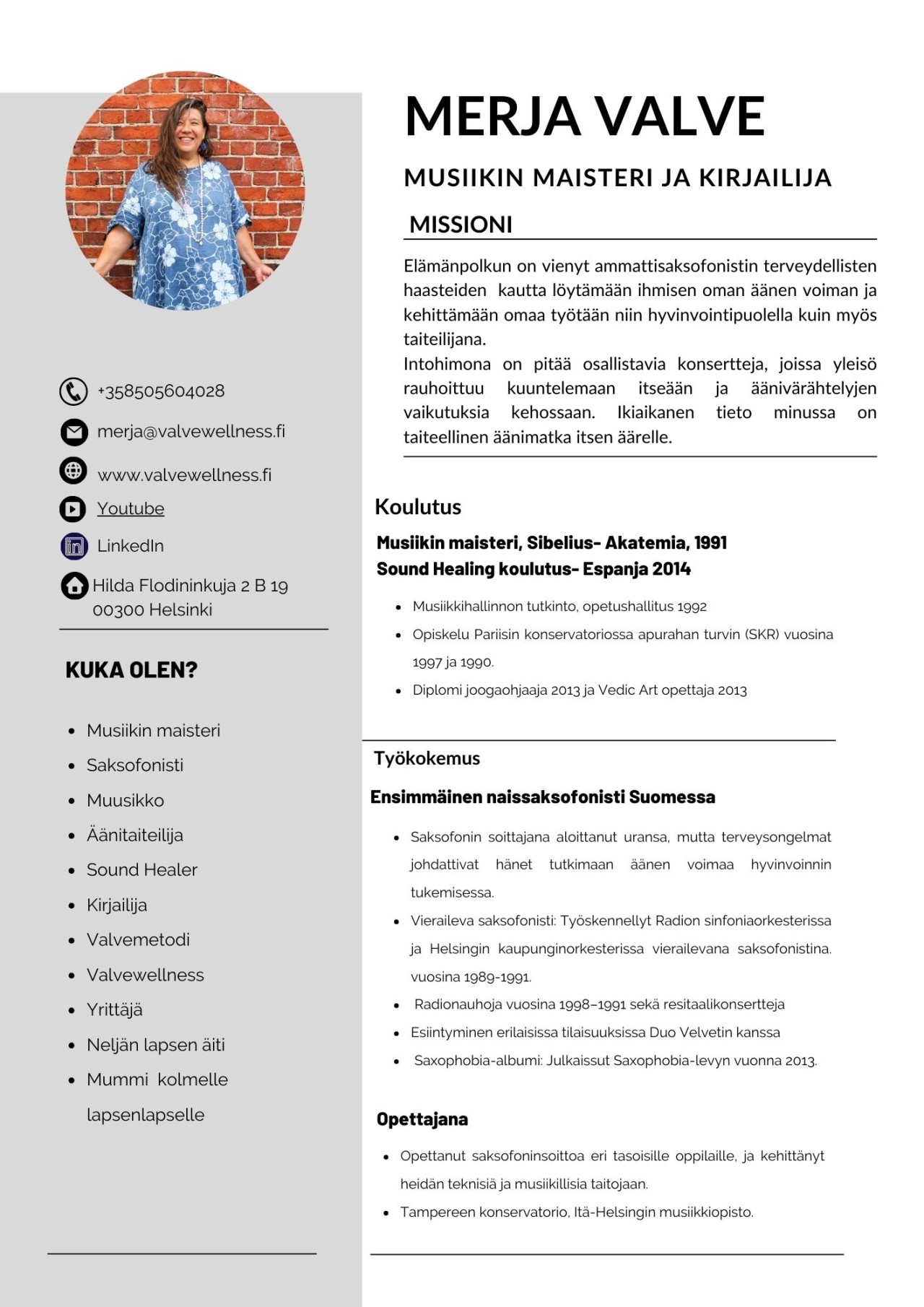 Olen Sibelius- Akatemiasta valmistunut saksofonisti (v.1991 musiikin maisteri), jonka loistokkaan uran katkaisi uupumus, tinnitus ja yliherkkä kuulo. Saksofonistina soitin vierailevana muusikkona orkestereissa, pidin resitaalikonsertteja ja soitin Duo Velvetin kanssa erilaisissa tilaisuuksissa. Opetin myös saksofoninsoittoa useissa musiikkiopistoissa ja konservatorioissa. Loin sekä Tampereen konservatorioon että Itä-Helsingin musiikkiopistoon saksofoniluokan nollasta päätoimisen tuntiopettajan luokkaan.
