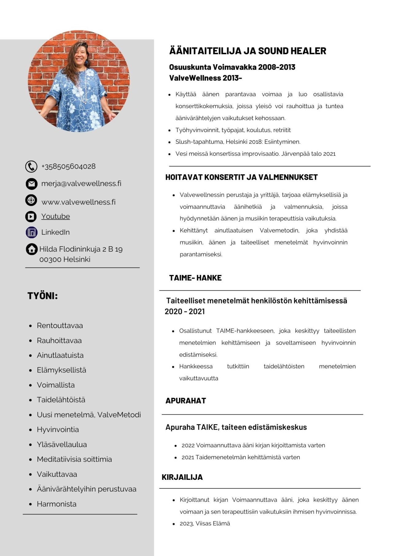 Opiskelin joogaohjaajaksi (RYT500), Vedic Art opettajaksi sekä Sound Healeriksi Espanjassa. Pidin hoitavia konsertteja, äänijoogaa, joogaa, retriittejä ja pidin työpajoja sekä äänikoulutuksia. Tein myös äänihoitoja sekä ostin uusia ihania soittimia. Kaikesta oppimastani ja kokemuksestani syntyi ValveMetodi, missä yhdistän energiatyöskentelyä, hoitavaa ääntä, soittimia, taiteellisia menetelmiä, kehollisuutta ja maalausta.